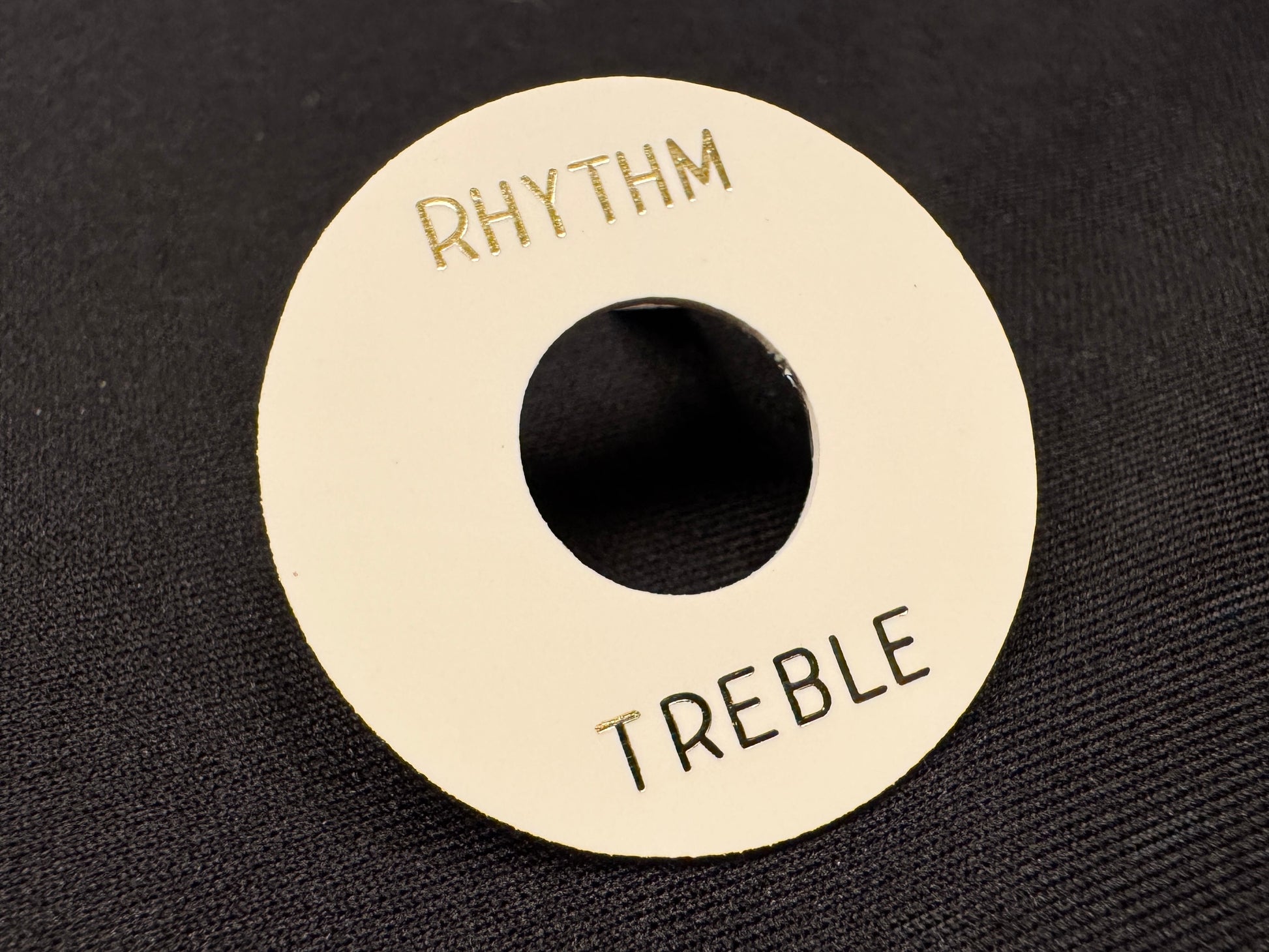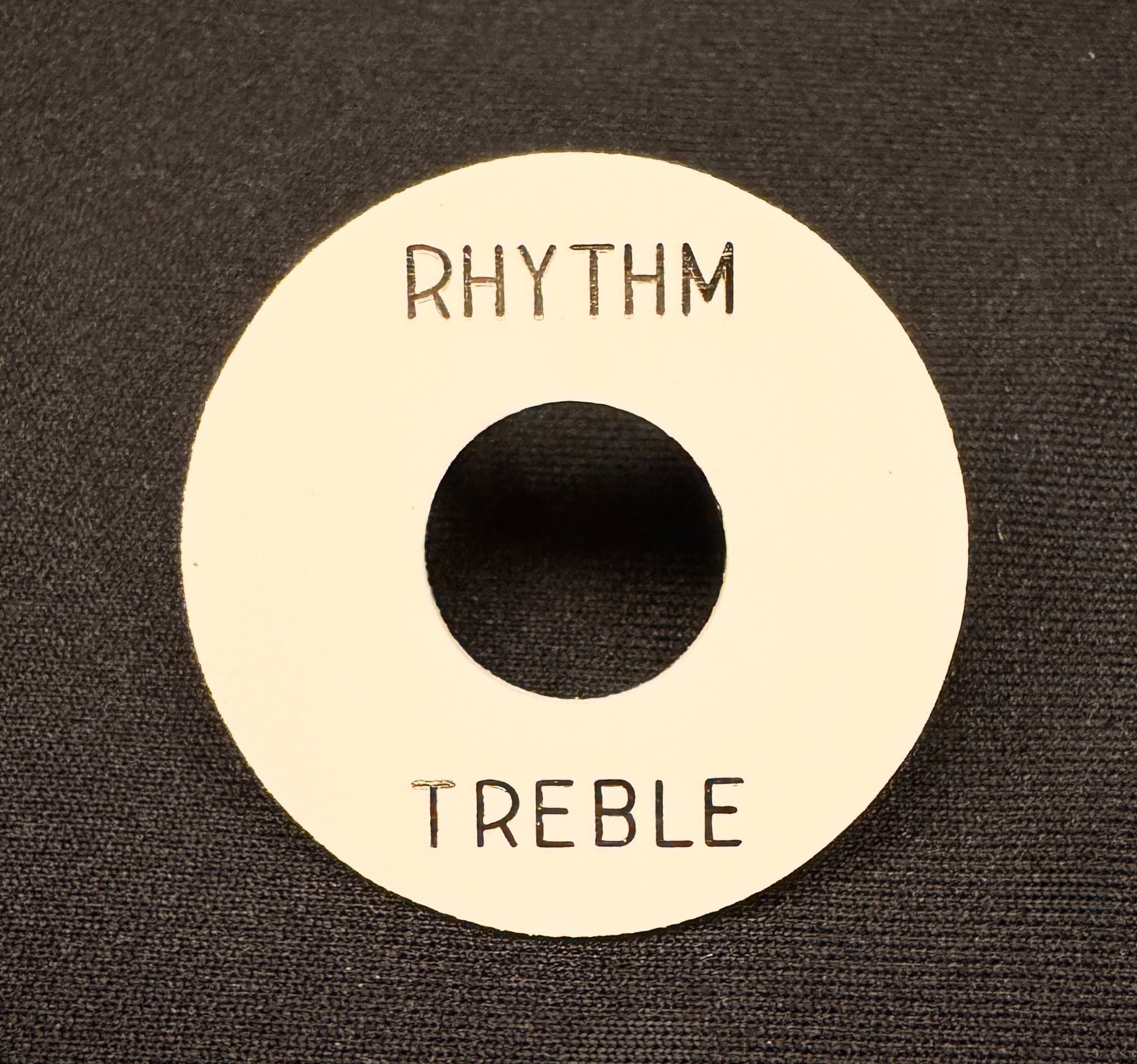 This is the unaged version of our great vintage correct poker chip switch ring in vintage white parchment with pale gold lettering. A must have for any upgrade of a Gibson Custom Shop R7 R8 R9 or any Gibson guitar you want to look a little more vintage Gibson Burst esthetic.